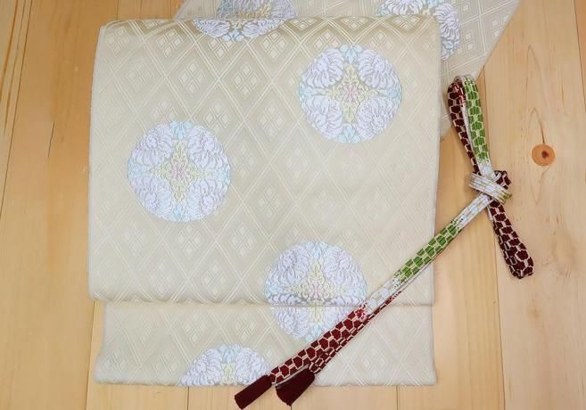 綸子 松皮柄絞り 九寸名古屋帯クリーム(名古屋仕立・帯芯込)