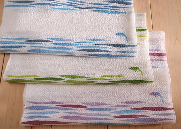 絽ちりめんに波のゆらぎとワンポイントにいるかを手染めした帯揚です。