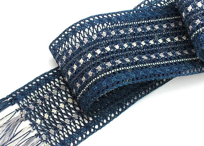 夏の男帯 羅織縞柄正絹角帯紺 房付