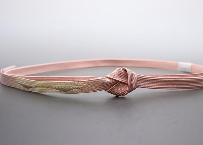 淡いピンクにシックなカラーや金糸をアクセントに加えた上品な印象の帯〆。