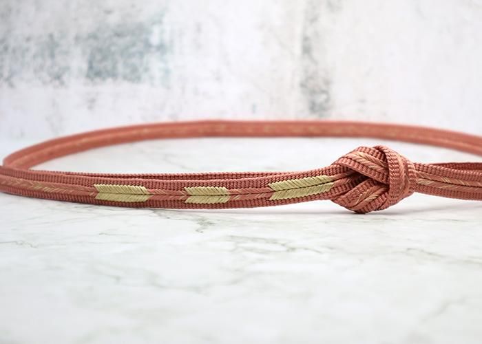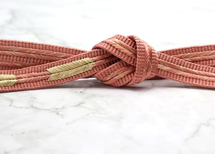 スモーキーピンクに金糸で矢羽根をあしらった華やかで上品な印象の帯〆。