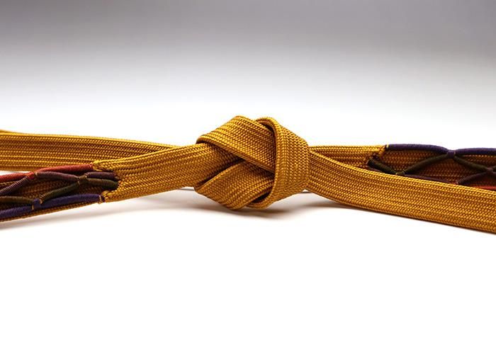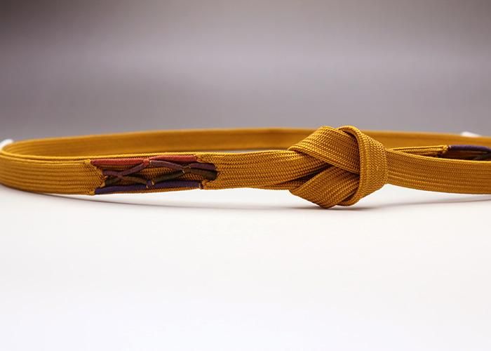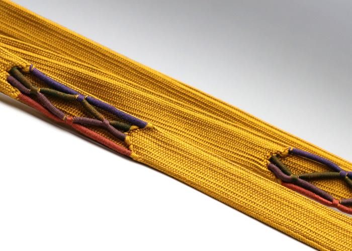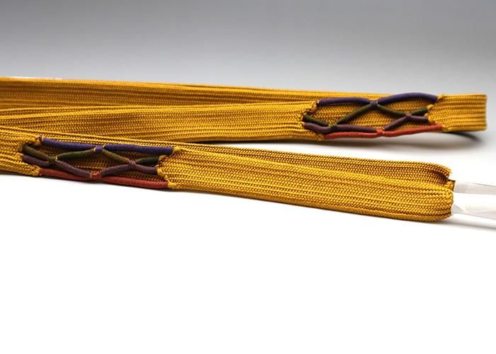 金茶の落ち着いた輝きにシックなマルチカラーの変わり組みがアクセントになった上品で個性的な印象の帯〆。