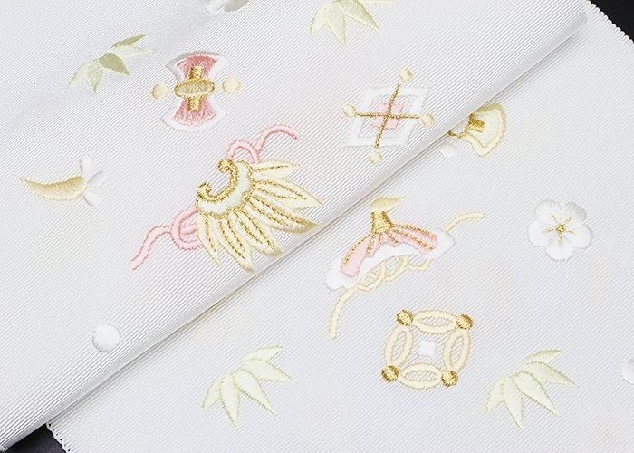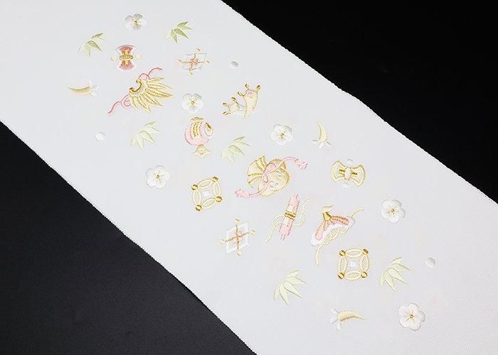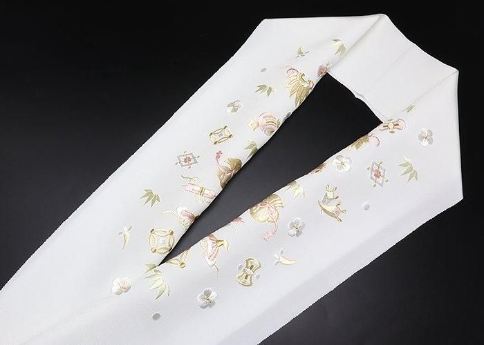 塩瀬の白地に白・金糸・ソフトな色糸を用い、宝紋様を散りばめた半衿です。