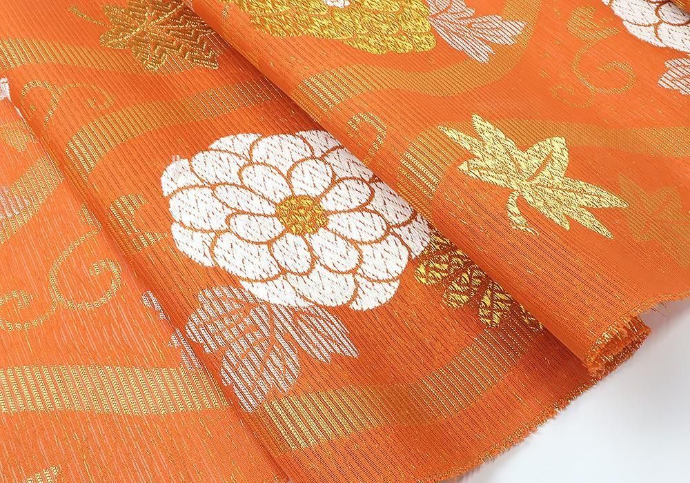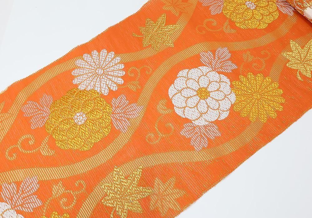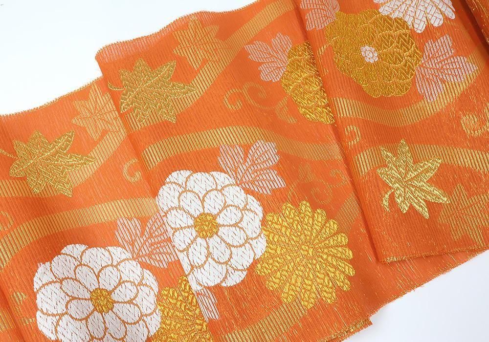 絽 長絹 九寸名古屋帯 立涌菊紅葉柄 六通 (お仕立・帯芯込)