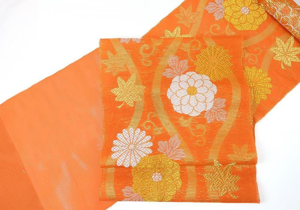 落ち着いた朱色地に立涌・大輪の菊、もみじ柄の涼しげな絽の名古屋帯です。