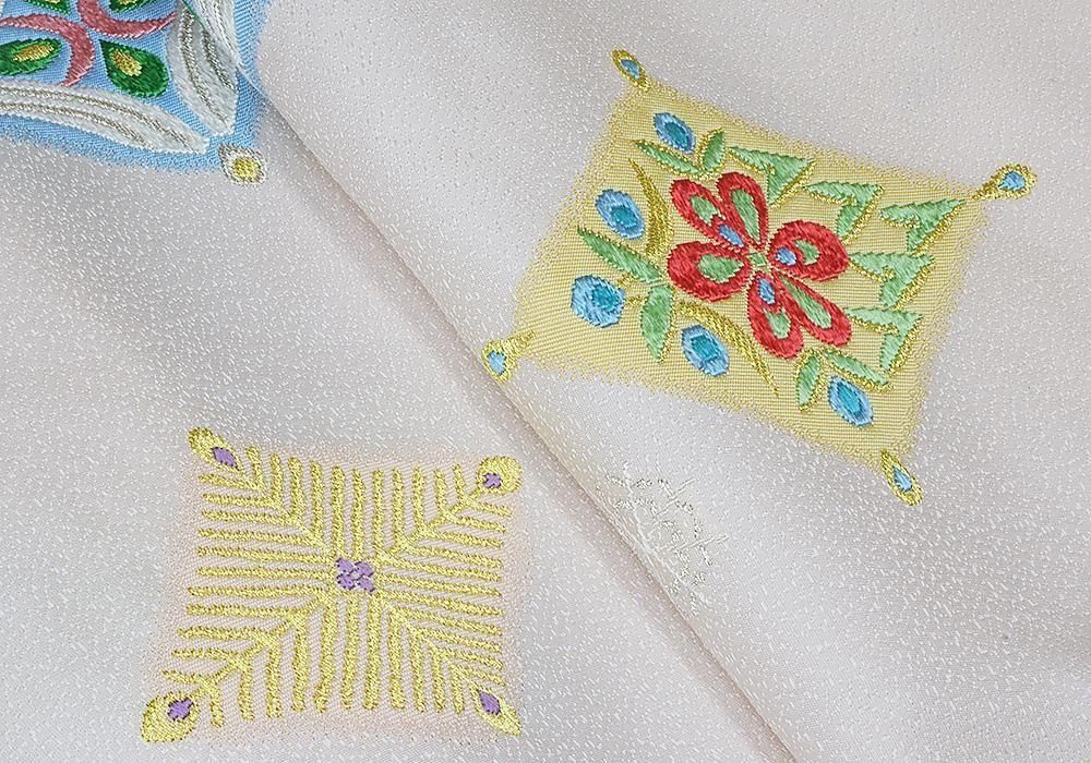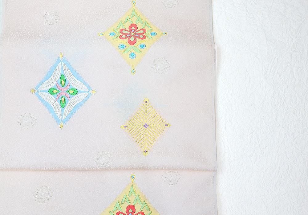 本品はソフトなピンクベージュ地に鮮やかな菱紋柄が印象的な名古屋帯です。3パターンの菱紋の間にシルバーで結晶のような小さな紋がポツポツと配されています。