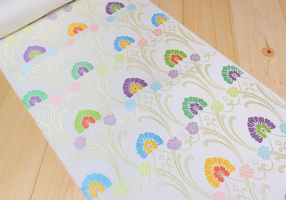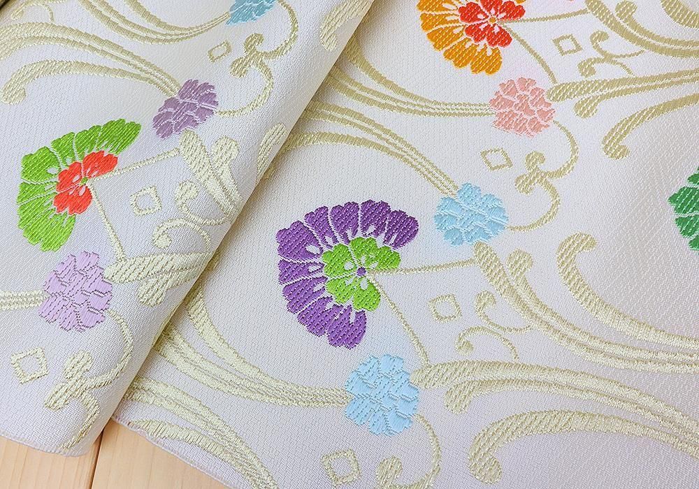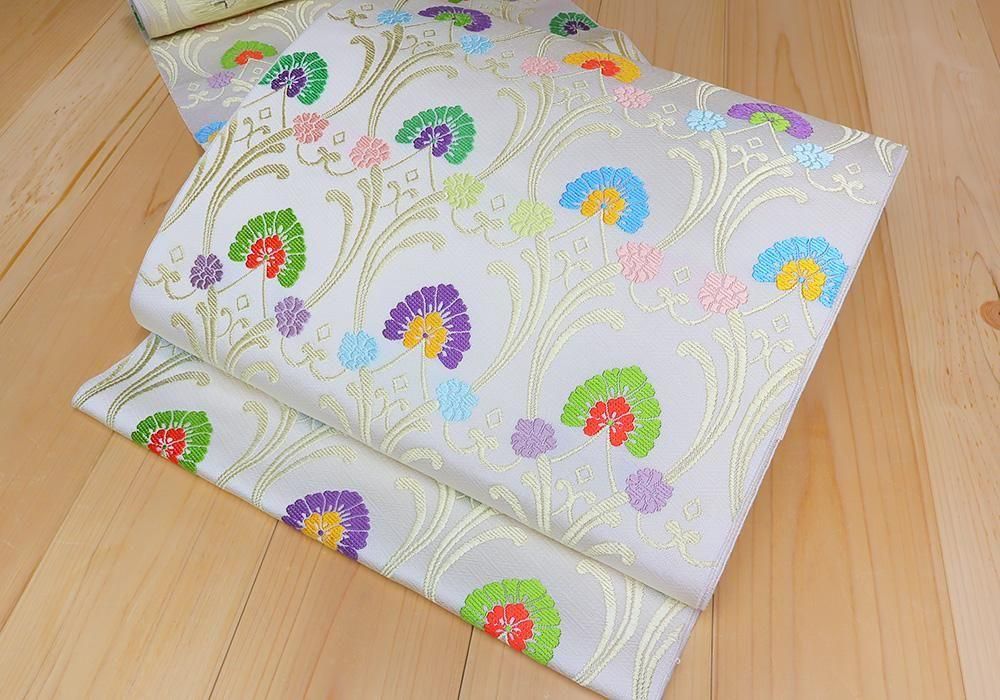 地色は薄いアイボリー系ですのでお着物に合わせやすく、結婚式やお茶会、パーティなど様々なシーンで活躍する帯です