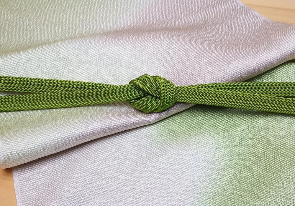 全体に金糸が入ったグリーン系ぼかしの帯揚げに高麗無地帯締めセット。
