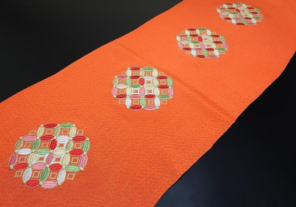オレンジに吉祥文様の七宝柄刺繍を多色で施した