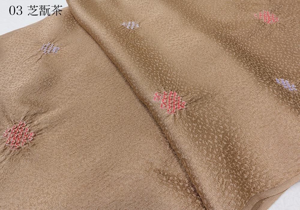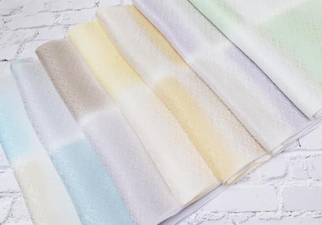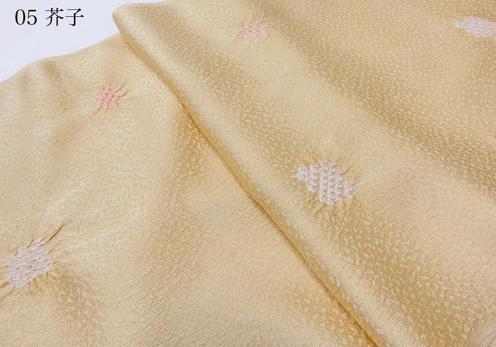 つるっと光沢のある地紋入り綸子地に所々形の違う絞りを入れた帯揚げです。